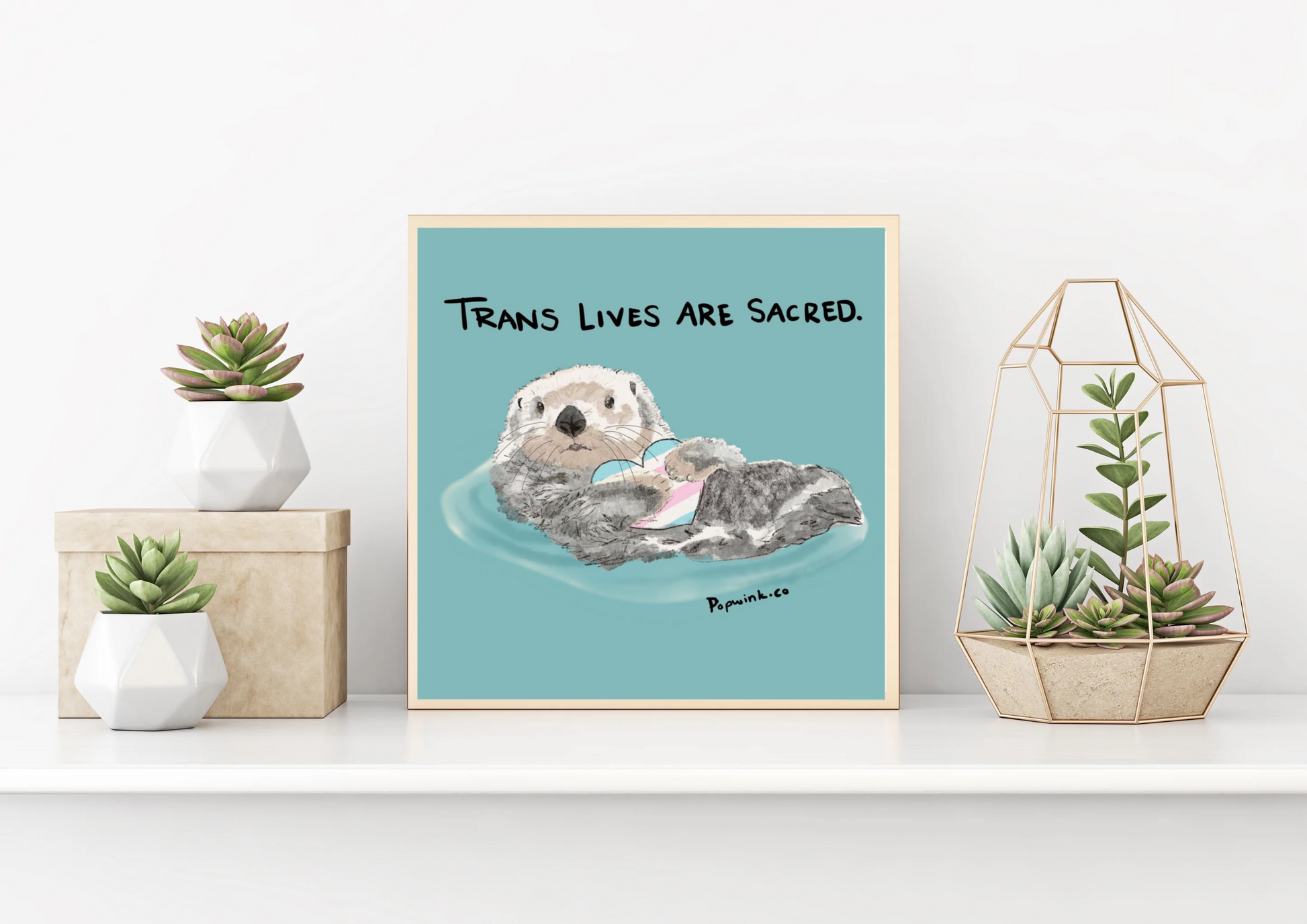 Trans Lives Are Sacred 8x8 inch print, cute Sea Otter, trans flag, affirming art